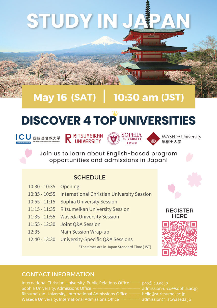 英語によるプログラムの機会、入学、日本での学生生活について、より詳しく知ることができます。参加登録された方はウェビナーの録画を後日ご視聴いただけます。