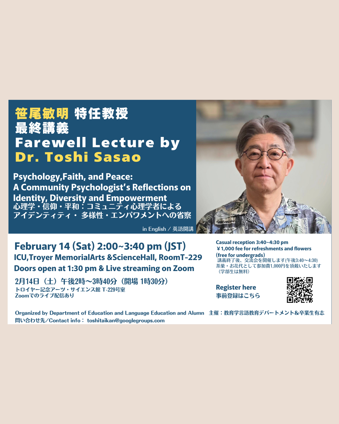 Farewell Lectureby Dr. Toshi Sasao 「Psychology, Faith, and Peace:A Community Psychologist's Reflections on Identity, Diversity and Empowerment」