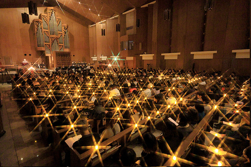 The University Candlelight Service, organized by the Religious Center, features many student volunteers. As in past years, a splendid night to celebrate the Christmas season included songs and music by the ICU Glee Club, Chamber Music Society, Bell Peppers, students taking the organ course organized by the Sacred Music Center, and scripture readings by students in multiple languages (Japanese, English, Italian, Kachin).