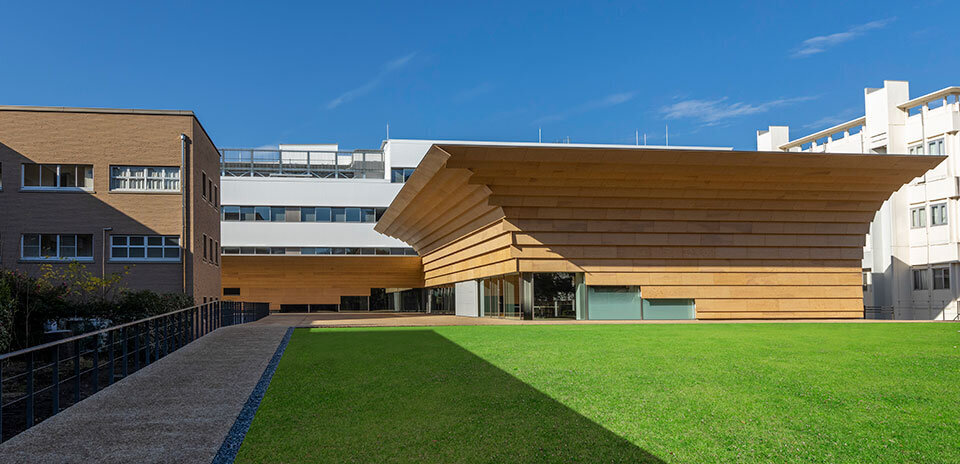 Completed in 2022 and opened for use in 2023, the Troyer Memorial Arts and Sciences Hall was jointly designed by Nihon Sekkei, Inc. and Kengo Kuma & Associates as an educational and research facility that fosters dialogue across academic disciplines. The building features a design that harmonizes with the university's "Campus Woodland." A massive approximately 7-meter cantilevered wooden eave and interior spaces composed of uniformly sized timber pieces create an environment that allows visitors to experience the warmth of wood. In addition, Himalayan cedar trees that originally stood on the construction site have been repurposed for room signage, interior maps, and furniture, reflecting a commitment to environmental consideration while preserving the memory of the university.
