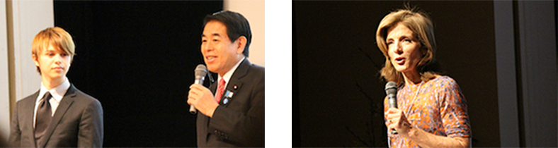 その後に催されたトークセッションには、ケネディ大使に加え、下村博文文部科学大臣と共に、アメリカからの留学生の1人として本学学生が登壇した。学生は、協定校からの留学生として本学で学ぶなか、留学の重要性は強く感じるているが、一方、日本からの派遣留学生が少なく、日本では、留学の必要性を学生に対してどのようにアピールしているか、と日本語で質問を行い、その流暢さに、会場から歓声があがった。