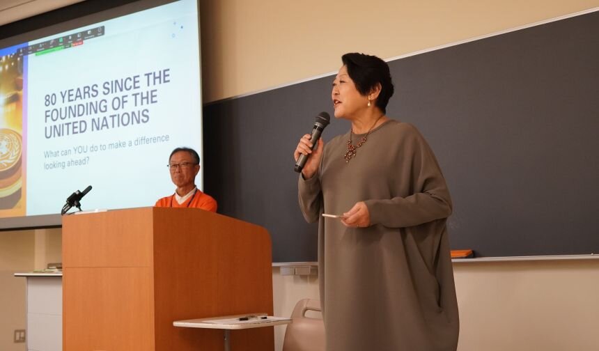 2025年10月16日、元国連大使であり卒業生の吉川元偉特別招聘教授が大学院科目「国際関係と外交」において、ゲストスピーカーとして国際連合(以下、国連)広報センター所長の根本かおる氏を招き、「国連創設80年 What can you do to make a difference looking ahead(変化を起こすためにあなたができること)」と題する講演会を英語で行いました。根本氏は1996年に報道記者から転身し国連難民高等弁務官事務所の職員としてネパールのブータン難民等を最前線で支援後、国連広報センター所長に応募し現在に至ります。当日は会場とオンラインあわせて約50名の学部生・大学院生・教員が参加しました。