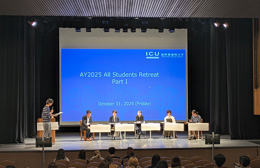 雨のため残念ながらキャンプ場での交流企画は中止になりましたが、イベントを通じて新入生がICUで学ぶことの意義を考える姿が印象的でした。